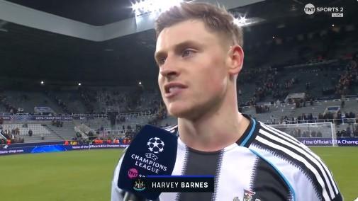 欧冠联赛阶段第7轮,纽卡主场3-0战胜埃因霍温,本场比赛打入1粒进球的纽卡前锋哈维-巴恩斯赛后接受了TNT体育的采访。
