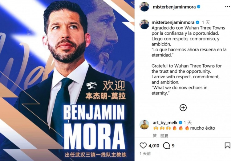 1月4日讯 正式出任三镇主帅职务后,本杰明·莫拉更新社媒,谈到了自己来到三镇执教的感受。