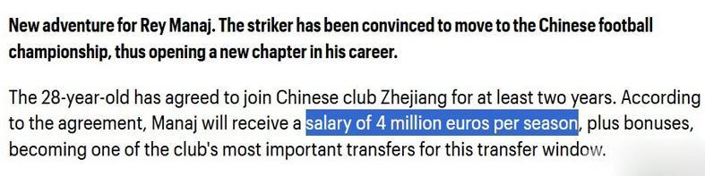 现年28岁的马纳伊身高1米82,是一名中锋,曾为国米一队、巴萨二队、沃特福德等队出过场。德转身价250万欧元,本赛季为阿联酋沙迦队出场20次,打进6球。据悉,浙江为他开出400万欧元的年薪,外加奖金。至少签下两年合同(中超限薪令单外援最高年薪为300万欧,含奖金等)。